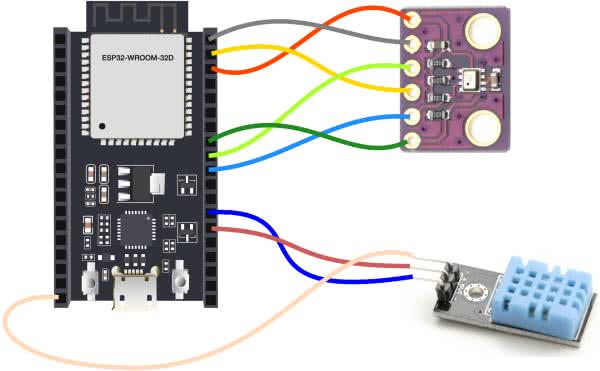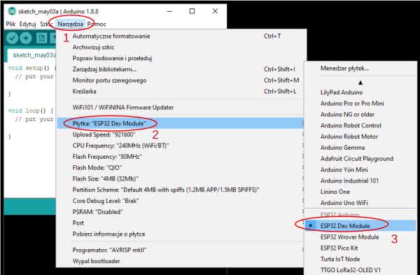 Pierwszym projektem nie będzie Helllo World, zamiast tego uruchomimy małą stację pogodową. Użyjemy czujników: temperatury, wilgotności oraz ciśnienia i wszystkie te parametry zaprezentujemy na stronie www. Żeby umożliwić prognozowanie pogody, przedstawimy wykresy wartości tych parametrów w czasie. W pierwszej kolejności do płyki ESP32 DevKitC V4 dołączymy czujniki BMP280 oraz DTH11, zgodnie z rysunkiem 5. W kolejnym kroku ustawimy w Arduino IDE docelową płytkę. Możemy wskazać sam moduł, jak na rysunku 6 - ESP Dev Module.