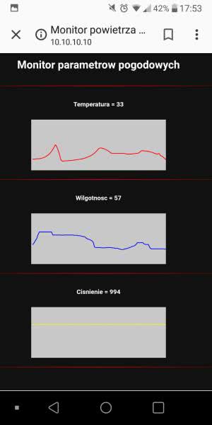 W sekcji programu określonej jako setup wstawiamy polecenia uruchamiające access point oraz serwer www - listing 3. Tych kilkanaście linii wystarczy, aby skonfigurować wszystkie elementy systemu, teraz można uzupełnić główną pętlę programu - listing 4. Główne zadanie, które wykonuje, to obsługa klienta - urządzenia, które łączy się z serwerem. Poza tym w głównej pętli mierzony jest czas pomiędzy pomiarami i gdy osiągnie ustaloną wartość, to następuje odczyt czujników, dodanie wyników do pamięci oraz wyświetlenie ich w terminalu.