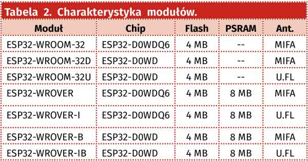 Na stronie producenta znajduje się krótka charakterystyka modułów (tabela 2). Oba moduły mają standardowo 4 MB pamięci Flash, ale dostępne są także wersje z pamięcią 8 lub 16 MB. Oba moduły dostępne są w wersji z anteną na pcb lub ze złączem antenowym. Natomiast tylko moduły WROVER są wyposażone w dodatkowe 8 MB pamięci RAM typu PSRAM (Pseudostatic RAM - to dynamiczna pamięć RAM z wbudowanym układem odświeżania i sterowania adresami, dzięki czemu zachowuje się podobnie do statycznej pamięci RAM. Łączy wysoką gęstość pamięci DRAM z łatwością użycia pamięci SRAM). Takie zestawienie kwalifikuje moduł do zastosowania np. w prostych systemach przetwarzania obrazu.