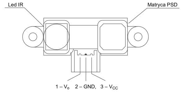 - wyjście napięcie o poziomie od 2,5 V do 0,5 V, proporcjonalne do zmierzonej odległości,