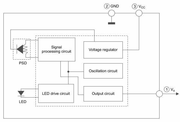 Na rysunku 3 pokazano schemat blokowy czujnika. LED oznacza diodę wytwarzającą skupioną wiązkę światła podczerwonego wysyłaną w kierunku obiektu. Po odbiciu światło pada na matrycę detektora PSD (Position Sensing Device). Moduł jest wyposażony w wewnętrzny oscylator i stabilizator, do którego podłączone jest wejście zasilania Vcc. Sygnał proporcjonalny do wyniku pomiaru wytwarzany jest w układzie pomiarowym (Signal processing circuit) i poprzez bufor wyprowadzany na wyjście Vo.