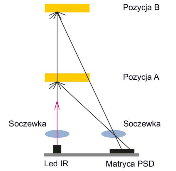 Do obliczenia dystansu pomiędzy czujnikiem a obiektem służy metoda triangulacji. Istotę metody i działanie czujnika objaśnia rysunek 4. Dioda Led IR wytwarza wiązkę światła podczerwonego skupionego przez soczewkę do rozmiarów niewielkiej plamki. Po odbiciu od przeszkody, plamka światła pada na matrycę PSD.