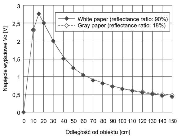 W zależności od odległości, w jakiej znajduje się obiekt, odbite światło pada na matrycę pod innym kątem i w innym miejscu. To przesunięcie, proporcjonalne do odległości obiektu, zamieniane jest na odpowiedni poziom napięcia wyjściowego Vo. Wykres napięcia w funkcji zmierzonej odległości pokazany został na rysunku 5.