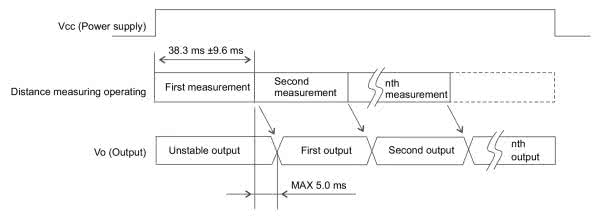 Czujnik GP2Y0A02YK0F wykonuje pomiary nieprzerwanie od momentu podłączenia zasilania. Co około 40 ms odświeżane jest ustawienie napięcia wyjściowego Vo. Na rysunku 6 pokazano zależności czasowe cyklu kolejnych odczytów.