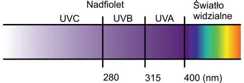 Na rysunku 1 pokazano umowny podział widma światła w zależności od długości fali. Ultrafiolet ze względu na oddziaływanie na organizmy żywe dzielony jest na trzy podzakresy. Promieniowanie UVA jest najmniej szkodliwe. Potrafi najgłębiej wnikać w głąb skóry i w dużych dawkach prowadzi do uszkodzenia włókien kolagenowych przyśpieszając starzenie. UVB w niskich dawkach powoduje wytwarzanie w skórze witaminy D3 co jest korzystne dla organizmu. W większych powoduje oparzenia i zmiany chorobowe. Energia promieniowania UVC jest na tyle duża, że może rozbijać łańcuchy DNA i niszczyć żywe komórki.