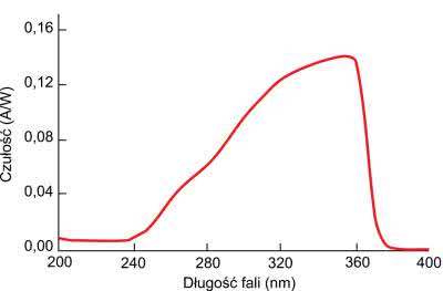 Na fotografii 1 został pokazany moduł czujnika, w którym jako detektor promieniowania ultrafioletowego pracuje fotodioda GUVA-S12SD. Na rysunku 2 została pokazana charakterystyka tego elementu. Fotodioda GUVA-S12SD reaguje na promieniowanie z przedziału od 370 nm do 240 nm, czyli jest wrażliwa na promieniowanie ultrafioletowe z zakresu UVA, UVB i częściowo UVC. Brak wrażliwości na światło widzialne eliminuje konieczność stosowania dodatkowych filtrów.