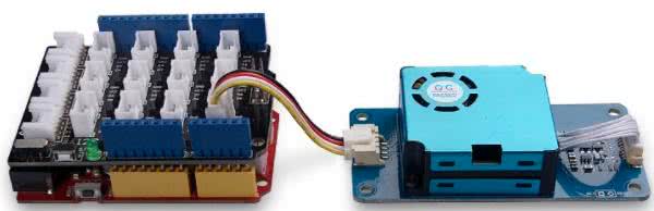 Moduł czujnika jest umieszczony na płytce drukowanej do której jest przymocowana obudowa detektora z wentylatorem tak jak to zostało pokazane na fotografii tytułowej. W komplecie z czujnikiem jest dodawany kabel z wtyczkami pasującymi do gniazd płytki Grove Base Shield przeznaczonej do łączenia modułów Grove z płytką Arduino.