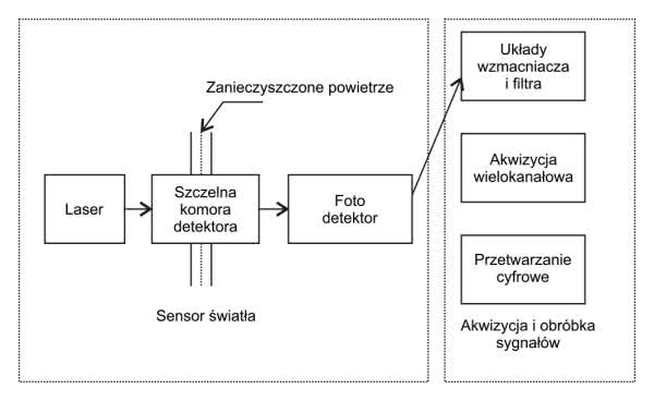 Zanieczyszczone powietrze jest dostarczane do układu czujnika przez mały wentylator. Przepływa przez specjalną komorę, gdzie zanieczyszczenia są oświetlane przez światło lasera pracującego w podczerwieni. Światło, jak już wiemy, ulega rozszczepieniu na cząstkach pyłu i trafia na powierzchnie fotodetektora. Sygnał z fotodetektora jest następnie filtrowany, wzmacniany i przetwarzany cyfrowo (rysunek 1).