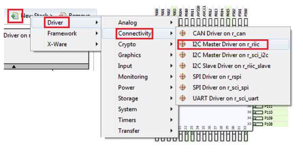 Komunikację z czujnikami realizuje sprzętowy interfejs IIC1 skonfigurowany przez konfigurator Synergy Configuration wbudowany w pakiet e2 studio. W pierwszym kroku konfiguracji wybieramy zakładkę Threads. Sterownik zostanie skonfigurowany w domyślnym wątku HAL/Common. Wybierany w oknie HAL/Common Stacks ikonę New Stack i w rozwijanym menu wybieramy: New Stack → Driver → Connectivity → I2C Master Driver on r_iic (rysunek 3).