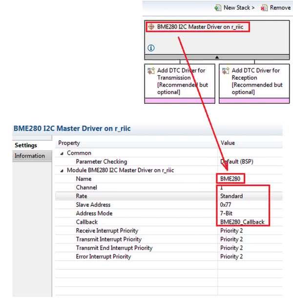 Dodany sterownik (driver) pojawia się w oknie HAL/Common Stacks i można go skonfigurować w oknie Properties. W oknie Name nadajemy swoją nazwę. W naszym przypadku jest to BME280. Ta nazwa potem występuje w funkcjach sterownika. Okno Channel wybiera numer kanału interfejsu I2C. Prędkość transmisji wybiera się w oknie Rate. Ze względu na wymagania magistrali I2C sensora HM3301 trzeba ustawić opcję Standard. Adres układu slave wpisuje się w oknie Adres Slave, a format adresu w oknie Address Mode (adres 7-bitowy). Dla układu BME280 wpisujemy adres 0x77, który potem będzie zmieniany zależnie od potrzeb. Priorytety przerwań zgłaszanych przez moduł I2C są ustawiane w 4 ostatnich oknach.