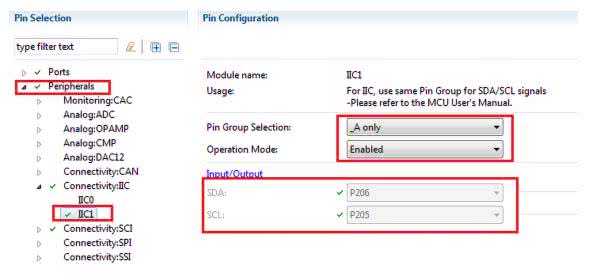 W kolejnym kroku trzeba wybrać zakładkę Pins konfiguratora Synergy Configurator i skonfigurować wyprowadzenia interfejsu I2C, tak by był sprzętowo zgodny z płytką Arduino. Interfejs I2C musi używać portów P206 i P207. Zostało to pokazane na rysunku 5.