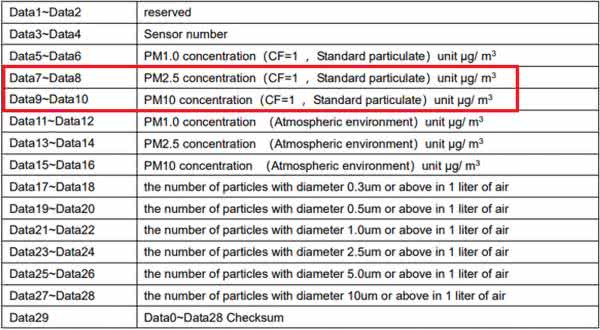 Na rysunku 7 pokazano transfer danych w czasie ich odczytywania z czujnika przez magistralę I2C, a na rysunku 8 fragment dokumentacji z rozmieszczeniem danych odczytywanych z układu sensora. Odczytujemy 16 bajtów, a wykorzystujemy do wyświetlania dane DATA7, 8, 9 i 10. Zawierające stężenie pyłów 2,5 μg/m3 i 10 μg/m3.