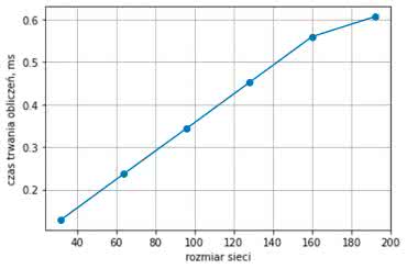 Jak pamiętamy z poprzednich odcinków, podczas konfiguracji sieci neuronowej w bibliotece możemy od razu przetestować jej działanie w docelowym sprzęcie. Sprawdziłem więc czas obliczeń dla testowanych wcześniej sieci o rozmiarach od 32 do 196. Rezultat prezentuje rysunek 16. Jak widzimy, zależność jest mniej więcej liniowa (poza siecią o rozmiarze 196). Jednak czas wykonywania jest znacznie krótszy od czasu jednego cyklu w naszym projekcie, czyli 50 ms.