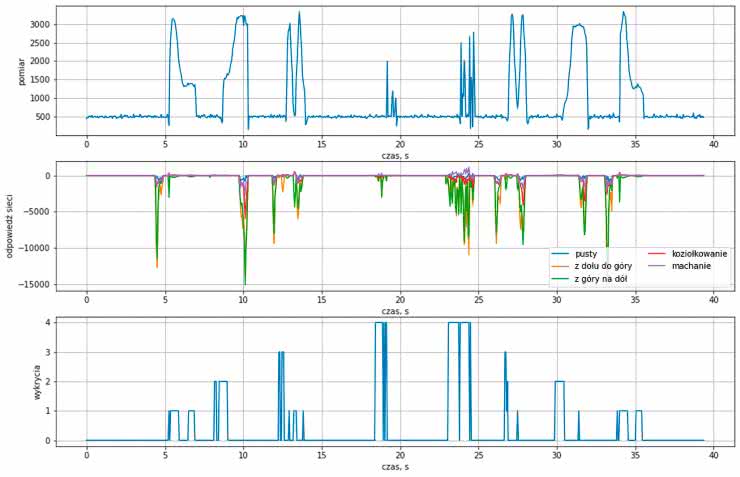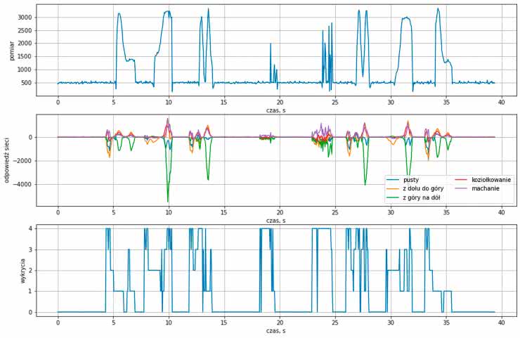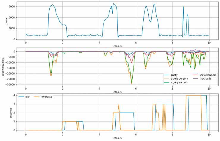 Środkowy to wyjścia z sieci, prezentujące wartości przypisywane poszczególnym gestom. Ostatni prezentuje wyjście z sieci (kolor pomarańczowy) oraz odpowiedź naszego prostego filtru (niebieski). Uzyskany efekt możemy też zobaczyć na filmie [2].