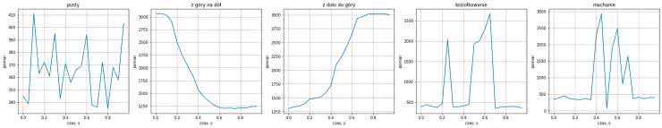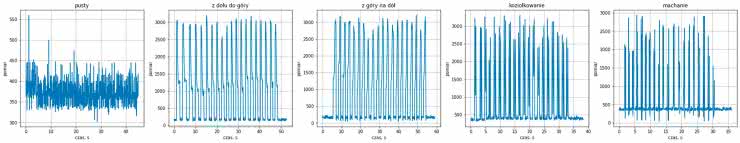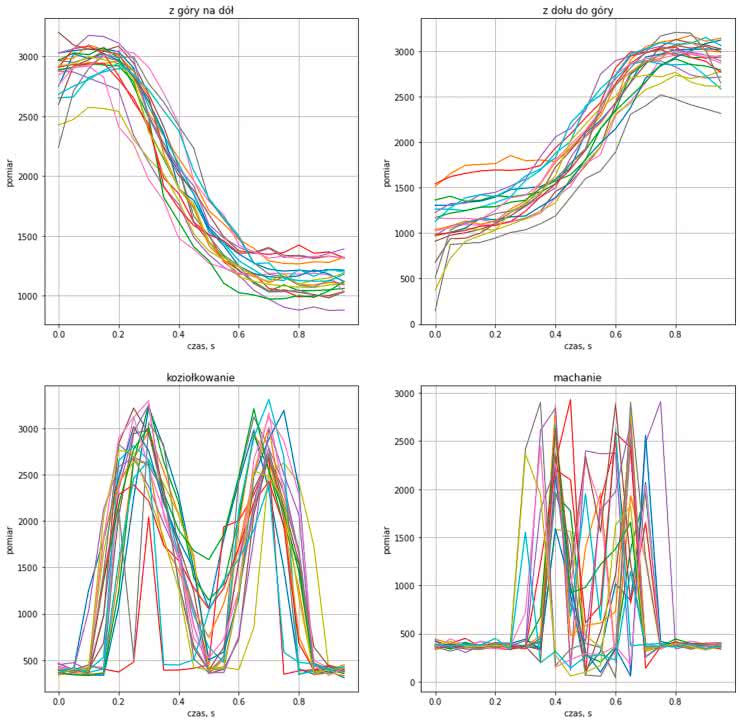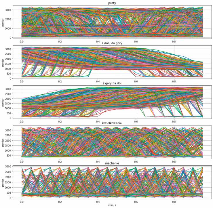 Zwraca ona wykres z wyrysowanymi (jedne na drugich) kolejnymi gestami. Możemy wywoływać ją, dobierając kolejne wartości wektora start i obserwować, czy kolejne wykresy są do siebie podobne. Jeżeli plątanina krzywych jest zbyt duża, możemy zmniejszyć liczbę rysowanych przebiegów, zwiększając parametr i_min. Bardziej zaradni czytelnicy mogą przygotować skrypt, który wyznaczy orientacyjne wartości wektora start na podstawie przekroczenia przez wartość określonych progów. Uzyskane przeze mnie krzywe prezentuje rysunek 5.