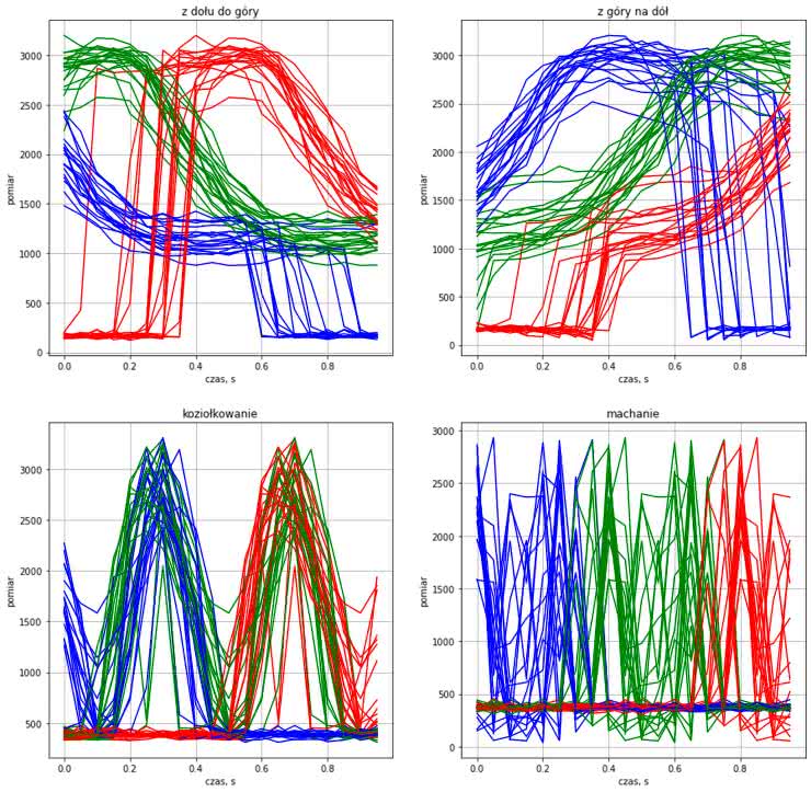 Tutaj drobna ciekawostka. Początkowo zrobiłem błąd i próbki zapisywałem w odwrotnej kolejności: od najnowszej do najstarszej. Projekt działał prawie poprawnie. Jedyny błąd to gest z góry na dół był wykrywany jako z dołu do góry i odwrotnie. Pozostałe dwa gesty działały poprawnie. Zanim znalazłem prawdziwą przyczynę, próbowałem kilkakrotnie na nowo przygotowywać dane uczące dla tych dwóch gestów i szkolić ponownie sieć. Jednak ciągle działanie było takie samo. Okazuje się więc, że moje ruchy ręką są całkiem symetryczne w czasie :).