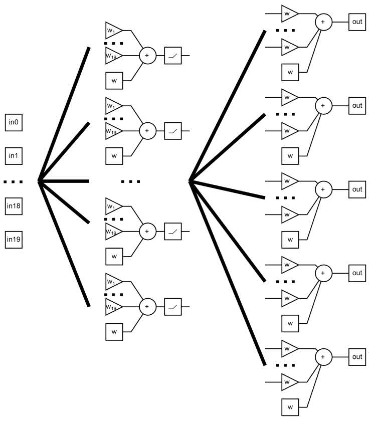Schemat sieci widzimy na rysunku 7. Pierwsza warstwa jest złożona z size neuronów z funkcją aktywującą ReLU. Każdy z nich ma dwadzieścia wejść i przyjmuje pełny wektor wejściowy. Warstwa wyjściowa ma zawsze pięć neuronów: po jednym dla każdego z gestów oraz braku detekcji. Każdy z nich ma size wejść: przyjmuje wyjścia z każdego neuronu z poprzedniej warstwy. Warstwa wyjściowa ma liniową funkcję aktywacji.