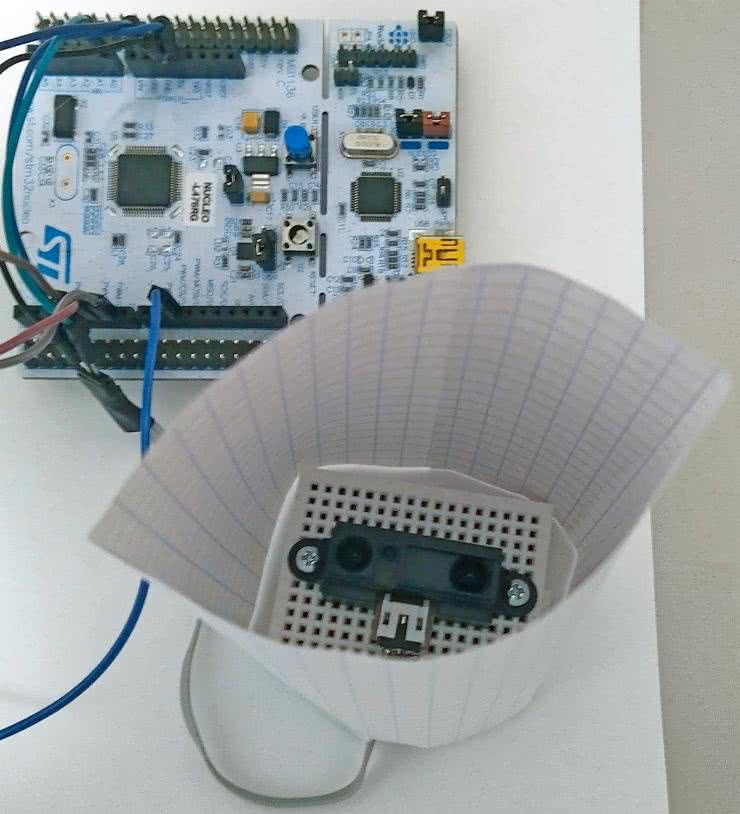 Czujnik jest zasilany z płytki, a jego wyjście jest podłączone do złącza A0. Złożony model prezentuje fotografia 2. Na czujnik została nałożona papierowa rura. Zapobiega ona przyłożeniu ręki zbyt blisko czujnika, którego zakres pracy wynosi od 10 do 80 cm.