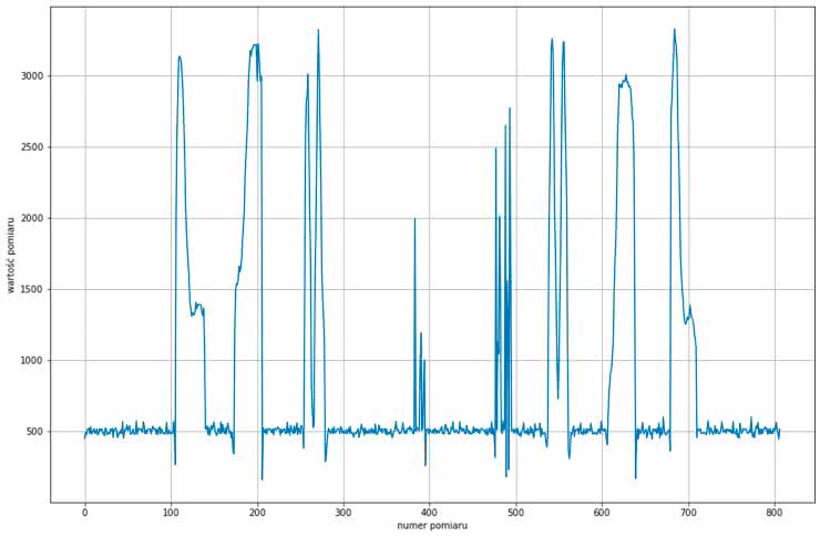 Przy pierwszym podejściu do nauki sieci jako przykładu gestów użyłem tylko przebiegu z niezasłoniętego czujnika, który znamy z rysunku 3. Kod, który posłużył do utworzenia zbioru treningowego i walidacyjnego, prezentuje listing 1. Najpierw do zbiorów treningowego i walidacyjnego zostały dodane wszystkie ciągi z nagranego niezasłanianego czujnika. Do zbioru walidacyjnego trafiała co 10. próbka. Następnie do zbiorów zostały dodane wszystkie ciągi zawierające gesty, czyli te zaczynające się o ±K próbek względem wyznaczonych początków gestów.