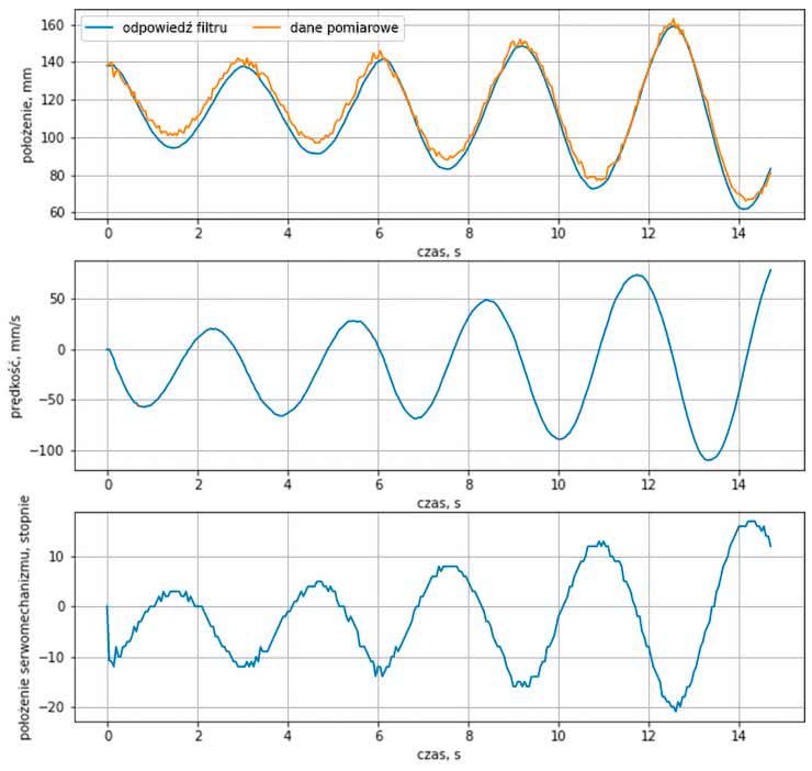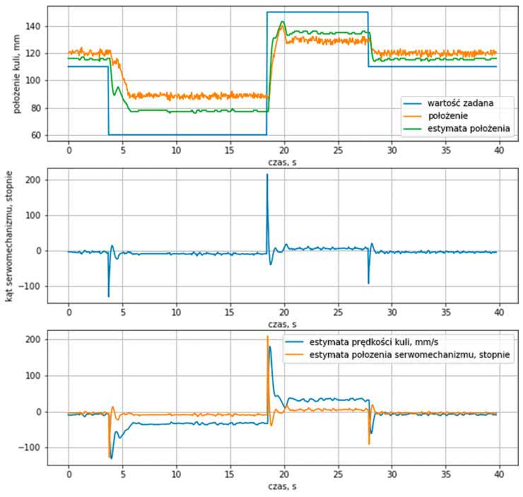 Pierwszy wykres pokazuje wartość zadaną, zmierzone położenie i jego estymatę. Widoczny jest uchyb ustalony. Spowodowany jest on małymi wartościami sterowania, dla których tarcie statyczne nie pozwala kulce ruszyć. Drugi wykres pokazuje wartości wygenerowanego sterowania. Pokazane są tu wartości przed przycięciem do maksymalnej możliwej wartości. Ostatni wykres prezentuje estymatę prędkości oraz położenia serwomechanizmu. Przebiegi dla kilku innych nastaw znajdują się w notatniku jupiter/Experiments.ipynb [13].