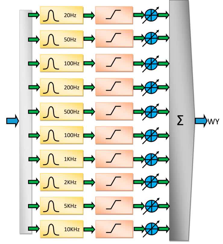 Pierwszy etap polega na przetworzeniu sygnału analogowego na cyfrowy za pomocą przetwornika znajdującego się w układzie kodeka. Następnie sygnał jest przetwarzany przez zespół filtrów cyfrowych, i w każdym kanale wytwarzane są zniekształcenia. Tworzenie zniekształceń polega na obcięciu chwilowej amplitudy sygnału. Następnie kanały są sumowane i sygnał cyfrowy wysyłany jest do przetwornika analogowo-cyfrowego zawartego w układzie kodeka.