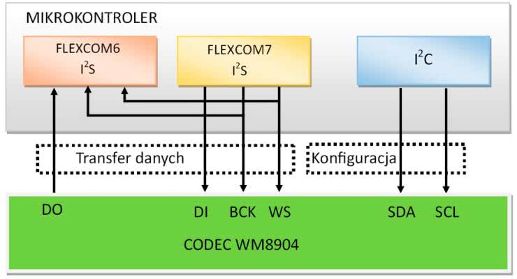 W naszym programie używamy gotowej biblioteki służącej do konfiguracji kodeka. Obsługa transmisji danych odbywa się poprzez dwa interfejsy I²S. Zastosowany mikrokontroler dostarcza system dziewięciu uniwersalnych bloków komunikacji szeregowej, nazwanych FLEXCOM, każdy z nich można skonfigurować jako jeden z interfejsów do transmisji danych (UART, USART, SPI, I²C, I²S). W naszym układzie korzystamy z FLEXCOM6 i FLEXCOM7, gdyż są one elektrycznie podłączone do układu WM8904. Interfejs I²S zaimplementowany na module FLEXCOM6 jest używany jako wejście sygnału akustycznego, natomiast transmisja odbywająca się poprzez FLEXCOM7 wysyła dane do przetwornika DAC, czyli pełni funkcję wyjścia. Ponieważ sygnały sterujące transmisją (BCK i WS) są takie same dla obydwu interfejsów, należy dokonać ich połączenia. Służy do tego moduł SYSCTL.