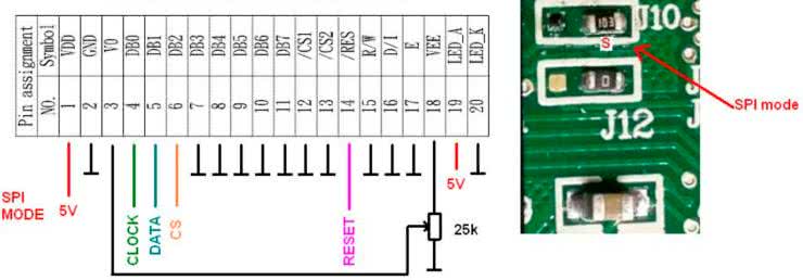 Zastosowany w naszym układzie wyświetlacz graficzny może pracować w dwóch trybach. Może być sterowany za pomocą transmisji równoległej lub szeregowej w protokole SPI. W naszym układzie stosujemy tryb transmisji szeregowej. Ponieważ wyświetlacz fabrycznie jest skonfigurowany do pracy przy transmisji równoległej, należy przełączyć zworę, która znajduje się na jego tylnej części (rysunek 11).