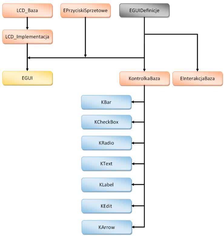 Główną klasą do obsługi interfejsu użytkownika jest EGUI. Umożliwia ona wyświetlanie treści na ekranie oraz odczyt wartości z przycisków i enkodera. Również za pomocą jej funkcji składowych można do interfejsu dodawać okna kontrolne wywodzące się z klasy EKontrolkaBaza. Na rysunku 8 pokazano hierarchię klas, natomiast na rysunku 9 pokazano strukturę interfejsu GUI naszego programu.