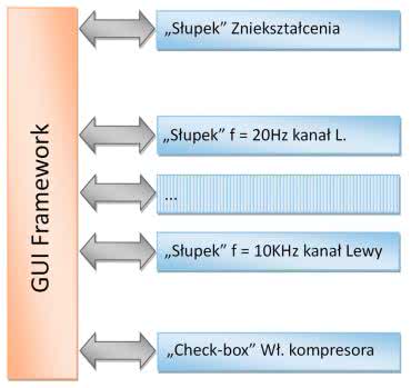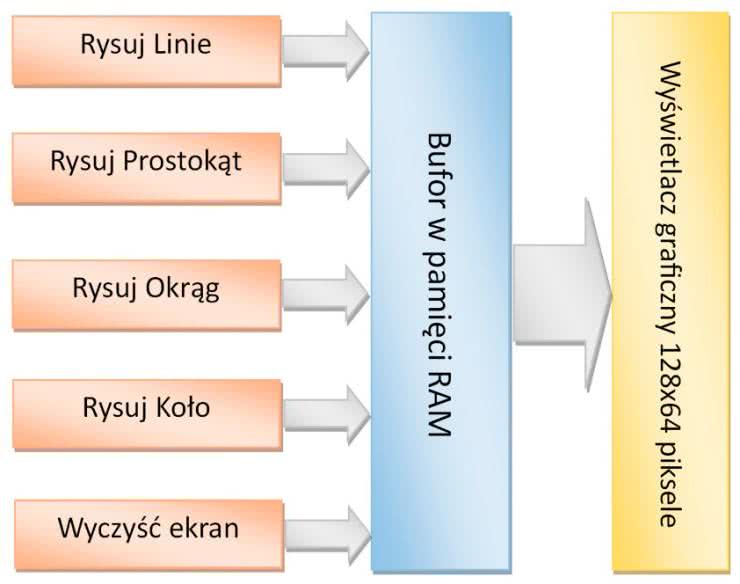 Interfejs GUI korzysta z biblioteki graficznej, również opracowanej przez autora, służącej do wyświetlania różnych kształtów na ekranie wyświetlacza. Koncepcję tej biblioteki obrazuje rysunek 10.