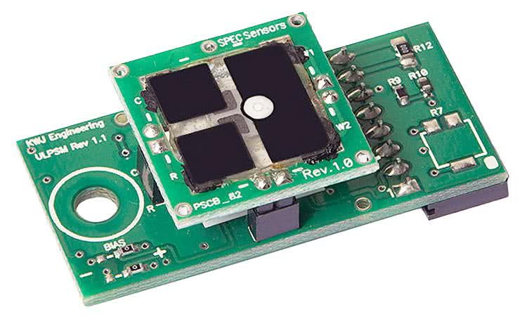 Wspomniana wcześniej firma SPEC Sensors wprowadziła na rynek również analogowy moduł pomiarowy ULPSM (Ultra-Low Power Sensor Module), umożliwiający dołączenie dowolnego firmowego czujnika gazu w obudowie z wyprowadzeniami goldpin [4]. ULPSM przekształca liniowy sygnał prądowy czujnika tlenku węgla na liniowy sygnał napięciowy, utrzymując czujnik w idealnym punkcie pracy.