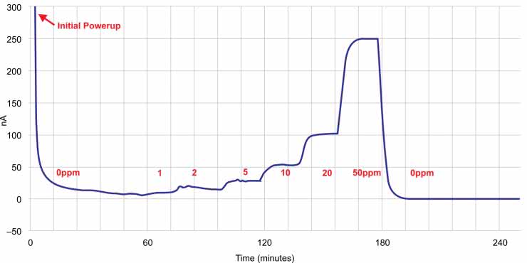 W przypadku czujnika elektrochemicznego efektywna powierzchnia „płytek” jest niezwykle duża. Zatem gdy na czujnik podane zostaje napięcie polaryzacji, obserwuje się „prąd ładowania” (rysunek 3). Prąd ten może początkowo wynosić nawet kilkaset μA, ale szybko spadnie do pojedynczych mikroamperów – w idealnym przypadku powinien mieścić się wręcz w zakresie nanoamperów. W czasie pracy czujnika prąd bazowy/zerowy asymptotycznie obniża się i stabilizuje, co oznacza poprawę jakości pomiarów.