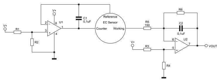 Obwód kontrolujący potencjał elektrody roboczej i przekształcający jej prąd na napięcie nosi nazwę potencjostatu. Uproszczony schemat czujnika i potencjostatu zaprezentowano na rysunku 2. Potencjał elektrody odniesienia RE ustalany jest przez stabilne napięcie na wyprowadzeniu 2 układu U1, natomiast potencjał elektrody roboczej WE – przez (również odpowiednio ustabilizowany) potencjał na pinie 5 układu U2. Różnica napięcia pomiędzy elektrodą WE oraz RE określana jest jako napięcie polaryzacji czujnika. Kiedy sensor gazu zostanie wystawiony na działanie gazowego CO, prąd przepływa od elektrody roboczej do przeciwelektrody. Prąd elektrody roboczej WE jest przekształcany na napięcie za pomocą wzmacniacza operacyjnego U2. Z kolei wzmacniacz operacyjny U1 generuje napięcie na przeciwelektrodzie CE, które wystarcza, by dostarczyć prąd o wartości równej prądowi elektrody roboczej, ale o przeciwnym kierunku [1].