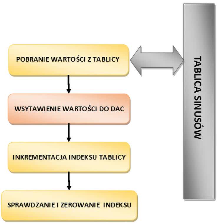 W generatorze sygnału sinusoidalnego stosujemy tablicę z zapamiętanymi wartościami tej funkcji, co znacznie przyspiesza działanie programu. Algorytm polega na odczytywaniu kolejnych wartości z tablicy i przesyłaniu ich do przetwornika cyfrowo analogowego w CODEC. Uproszczony algorytm działania generatora pokazany został na rysunku 4, natomiast kody procedur wyznaczania zniekształceń i generatora sygnału sinusoidalnego oraz rejestracji danych widoczne są na listingach 1 i 2.