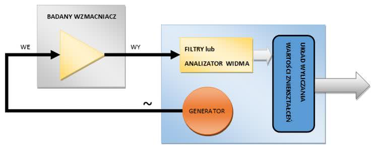Pomiar zniekształceń polega w ogólności na podaniu na wejście badanego układu sygnału sinusoidalnego i pomiarze oraz analizie napięcia wyjściowego. Jedną z metod jest odfiltrowanie składowej o częstotliwości przebiegu wejściowego, a następnie porównanie tych wartości. Inna metoda polega na wyliczeniu transformaty Fouriera i wyznaczeniu zniekształceń na podstawie składowych harmonicznych widma. Schemat blokowy układu do pomiaru zniekształceń nieliniowych pokazano na rysunku 1.