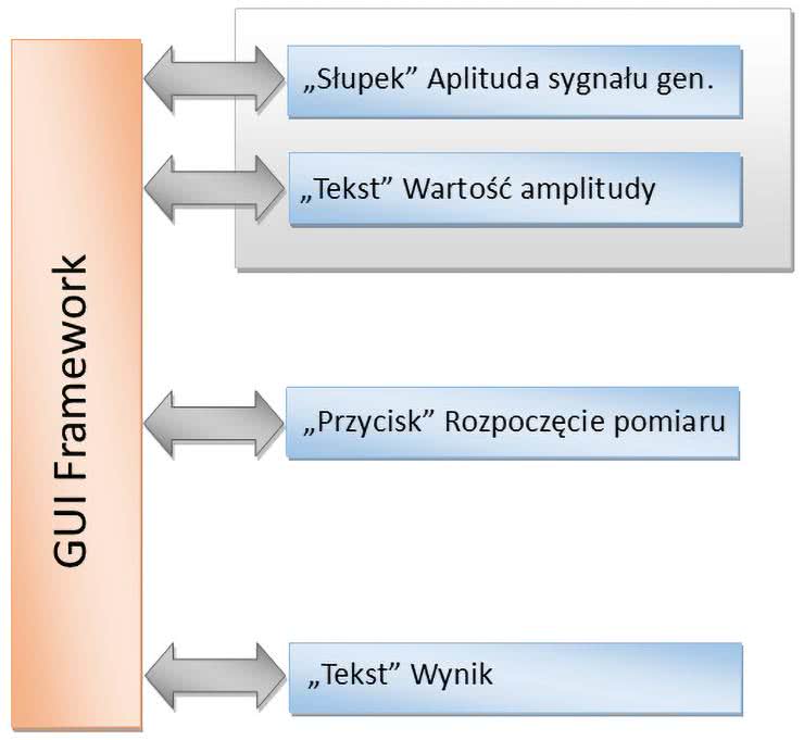 Do stworzenia interfejsu użytkownika użyto biblioteki napisanej przez autora. Współpracuje ona z wyświetlaczem graficznym 128×64 pikseli oraz obsługuje enkoder inkrementalny. W naszym przypadku zastosowaliśmy trzy obiekty interfejsu: słupek przyrostu, pole tekstowe oraz przycisk. Jedno z pól tekstowych – wraz ze słupkiem progresu – służy do wskazywania ustawionej za pomocą enkodera amplitudy sygnału. Kolejny obiekt, również typu pola tekstowego, służy do wyświetlania wyniku, czyli wartości zniekształceń nieliniowych. Wybranie pola typu przycisk powoduje rozpoczęcie pomiaru. Schemat obrazujący działanie interfejsu pokazany jest na rysunku 5.