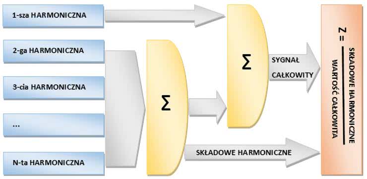 Składowe harmoniczne są to sygnały o częstotliwości stanowiącej całkowitą wielokrotność częstotliwości napięcia wejściowego. Ich zawartość (Z) określa poziom zniekształceń, ponieważ każdy sygnał okresowy składa się tylko z sinusoidy o częstotliwości podstawowej oraz składowych harmonicznych:
