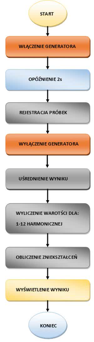 W celu zmniejszenia poziomu zakłóceń zarejestrowane dane zostają uśrednione. Pomiar wykonujemy dla 500 okresów, a następnie wyliczamy średnią arytmetyczną dla każdej próbki okresu. Wykaz kolejnych operacji wykonania pomiaru zniekształceń nieliniowych pokazano na rysunku 3.