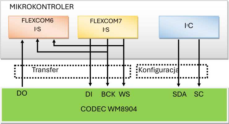 W skrócie opiszę jeszcze komunikowanie się procesora z CODEC. Konfiguracja procesora dźwiękowego odbywa się poprzez interfejs I²C, natomiast przesyłanie danych odbywa się w standardzie I²S. W mikrokontrolerze PLC55S28 każdy interfejs przesyłania danych realizuje się za pomocą odpowiednio skonfigurowanego uniwersalnego bloku WE.WY (FLEXCOM). Niestety, w tym rozwiązaniu nie można stworzyć pojedynczego interfejsu I²S zapisującego i odczytującego dane. Trzeba więc zastosować dwa bloki FLEXCOM (możliwości procesora umożliwiają połączenie dwóch takich bloków). W naszym przypadku do komunikacji w standardzie I²C stosujemy bloki FLEXCOM 6 i 7. Natomiast procedura przetwarzania dźwięku zapisana jest w procedurze obsługi przerwania kontrolera tych interfejsów. Schemat blokowy odzwierciedlający komunikację kodeka z mikrokontrolerem pokazany jest na rysunku 6.