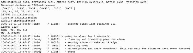 Oprogramowanie uruchamiane było w środowisku Thonny. Odczyt z czujników jest realizowany w pętli, na której końcu płytka Enviro Weather jest wprowadzana na 60 sekund w uśpienie z aktywnym zewnętrznym układem scalonym zegara RTC. Podczas zasilania z akumulatora wyłączeniu ulega zasilanie całej płytki Enviro Weather oraz wszystkich dołączonych czujników i modułu ADS1115, z wyjątkiem układu RTC. Z tego względu w pętli każdorazowo musi być wówczas wykonywana inicjalizacja układu ADS1115, a potem odczyt danych pomiarowych. Gdy podłączone jest zasilanie z portu USB, procesor RP2040 aktywnie oczekuje na ustawienie alarmu przez RTC – następnie wymuszany jest Reset. Oznacza to utratę łączności środowiska Thonny z płytką Raspberry Pi Pico W. Aby tego uniknąć, można w pliku /Enviro/__init__.py „zakomentować” linię 646 machine.reset(). Działanie takie nie zmienia funkcjonalności aplikacji, natomiast umożliwia ciągły podgląd wydruków w oknie Shell środowiska Thonny, w którym oprogramowanie firmowe Enviro Weather wyświetla dane informacyjne i debugowe (rysunek 2). Aplikacja także prezentuje przydatne informacje oraz dane pomiaru UV.