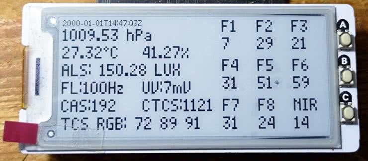 Na górze wyświetlacza pokazywane są: data i czas. Bez podłączenia Wi-Fi wyświetlana jest data zapisana w pliku last_time.txt. Po prawej stronie prezentowane są dane z dziesięciokanałowego czujnika wielospektralnego AS7341 [7], a po lewej stronie – od góry – dane odczytane z czujników płytki Enviro Weather: ciśnienie, temperatura i wilgotność z BME280; poziom oświetlenia z LTR-559. Dalej pokazywane są: FL – detekcja i częstotliwość migotania z AS7341; poziom UV (w mV); CAS – poziom oświetlenia z AS7341, CTCS – poziom oświetlenia z TCS34725 oraz (w ostatniej linii) kolory RGB z TCS34725. Jeśli nie podano jednostek, to dane są reprezentowane przez surowe wartości odczytu.