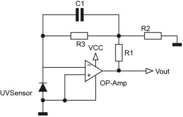 W firmowej nocie aplikacyjnej pokazany jest przykładowy schemat (rysunek 1) układu pomiarowego z fotodiodą GUVA-S12SD [2]. Jest to układ wzmacniacza transimpedancyjnego (TIA) rozbudowany o dzielnik R1 i R2 do postaci sieci T. Taka modyfikacja zwiększa wzmocnienie układu w przybliżeniu o wartość R1/R2, bez konieczności zwiększania wartości rezystora R3.