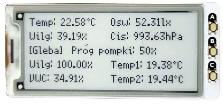 Wszystkie wyniki pomiarów i obliczeń są prezentowane na wyświetlaczu e-Paper (fotografia 1). Na górze ekranu wyświetlane są parametry otoczenia: temperatura, wilgotność, ciśnienie atmosferyczne i poziom oświetlenia. Dalej umieszczone są dane dotyczące pomiaru parametrów gleby: wilgotności (z pojemnościowego czujnika deszczu zestawu Enviro Grow) oraz z sensora SoilWatch 10. Po prawej stronie znajdują się wyniki pomiaru temperatury gleby z dwóch czujników.