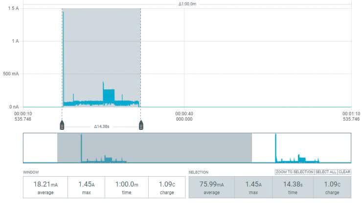 Uśrednione natężenie prądu za cały okres pomiarowy 1 min (zaznaczony na dolnym wykresie) wynosi tylko 18,21 mA. Pomiędzy blokami pomiarowymi pobór prądu spada do zaledwie 31 μA.