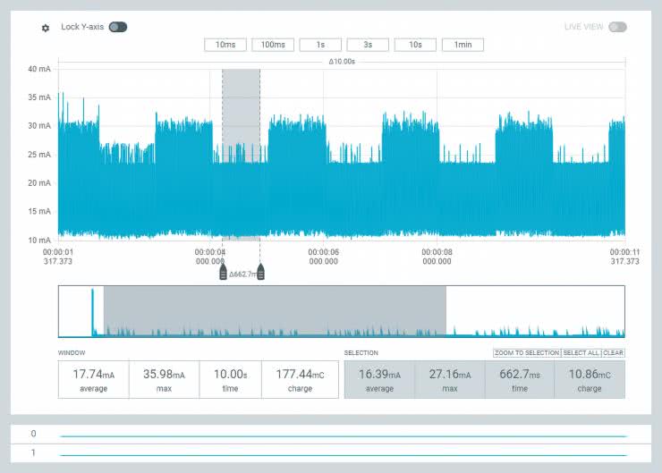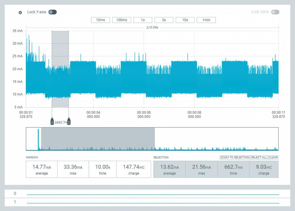Do dynamicznego pomiaru prądu zasilania bardzo dobrze nadaje się zestaw Power Profiler Kit II (PPK2) firmy Nordic Semiconductor. Jest to samodzielny układ, który bez zewnętrznego sprzętu może mierzyć i dostarczać prądy od poniżej μA do 1 A. Dokładny opis PPK2 jest zamieszczony w artykule „Profilowanie mocy z zastosowaniem Power Profiler Kit II” [21].
