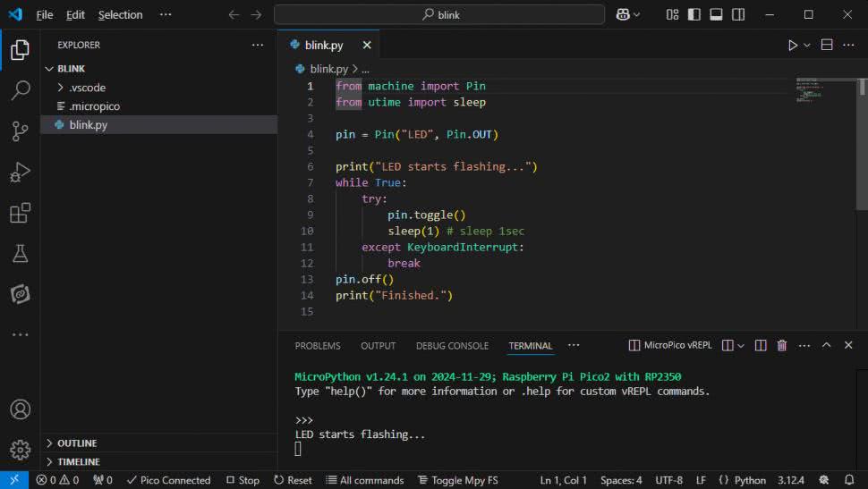 14. Ponownie kliknij prawym klawiszem myszki na plik blink.py i wybierz Run current file on Pico.