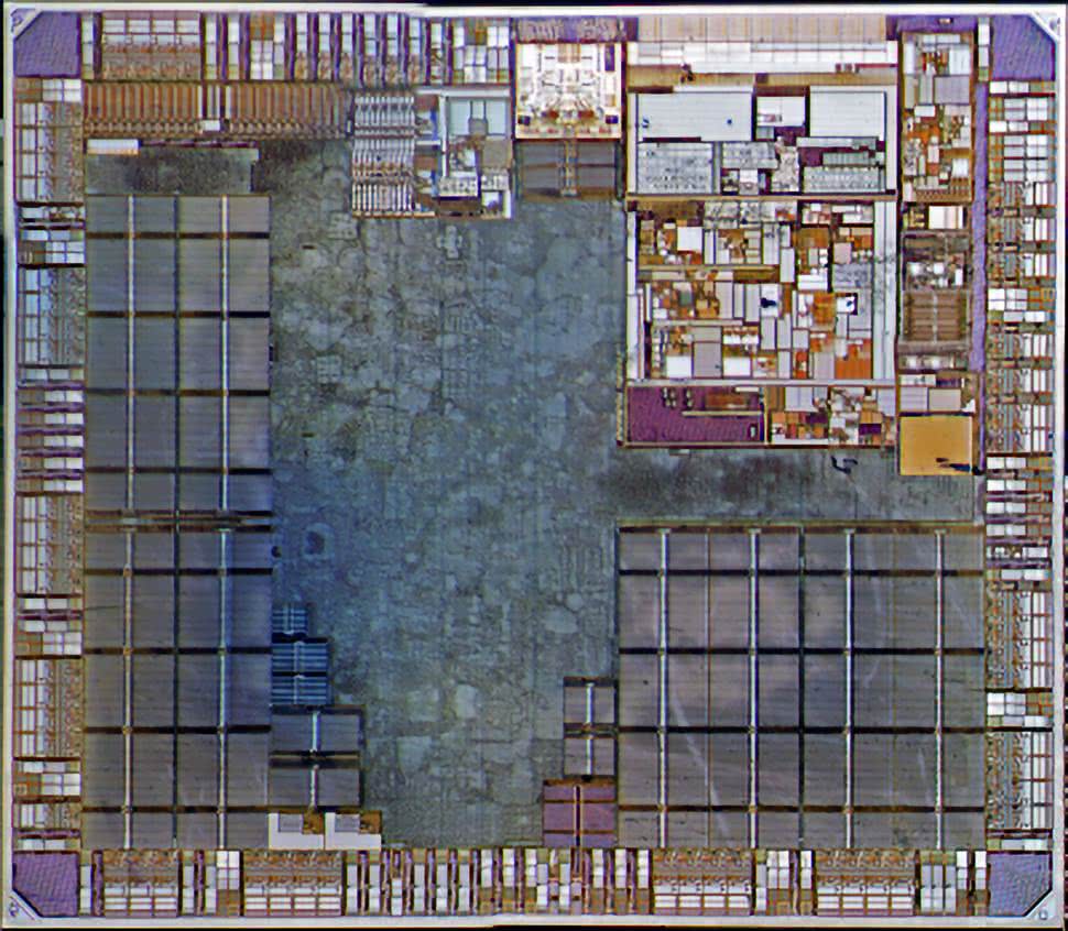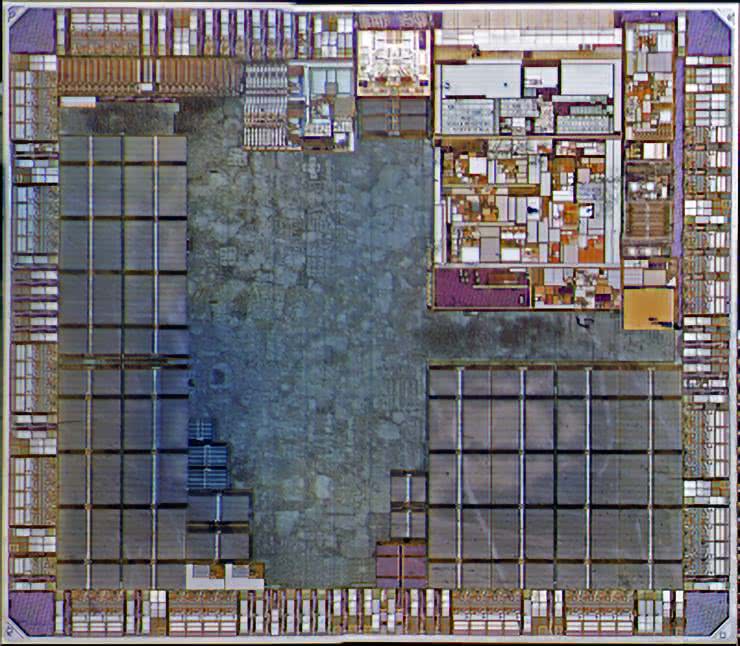 Na fotografii 1 zaprezentowano płytkę krzemową procesora po usunięciu obudowy i górnej warstwy metalowej. W produkcji układu została zastosowana ta sama technologia 40 nm, co w poprzednim RP2040. Matryca krzemowa RP2350 ma teraz powierzchnię 5,3 mm² w porównaniu do 2,7 mm² (w przypadku modelu RP2040). Lewy dolny róg matrycy został pokryty siecią dystrybucji zasilania projektu. Różowe obszary to fragmenty struktury nabytego przez producenta IP, takie jak interfejs USB, przetworniki ADC itp. [2].
