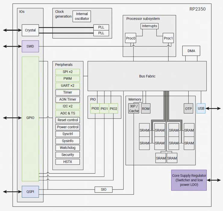 - RP2350 – brak wewnętrznej pamięci Flash, RP2354 – 2 MB wewnętrznej pamięci QSPI NOR Flash,