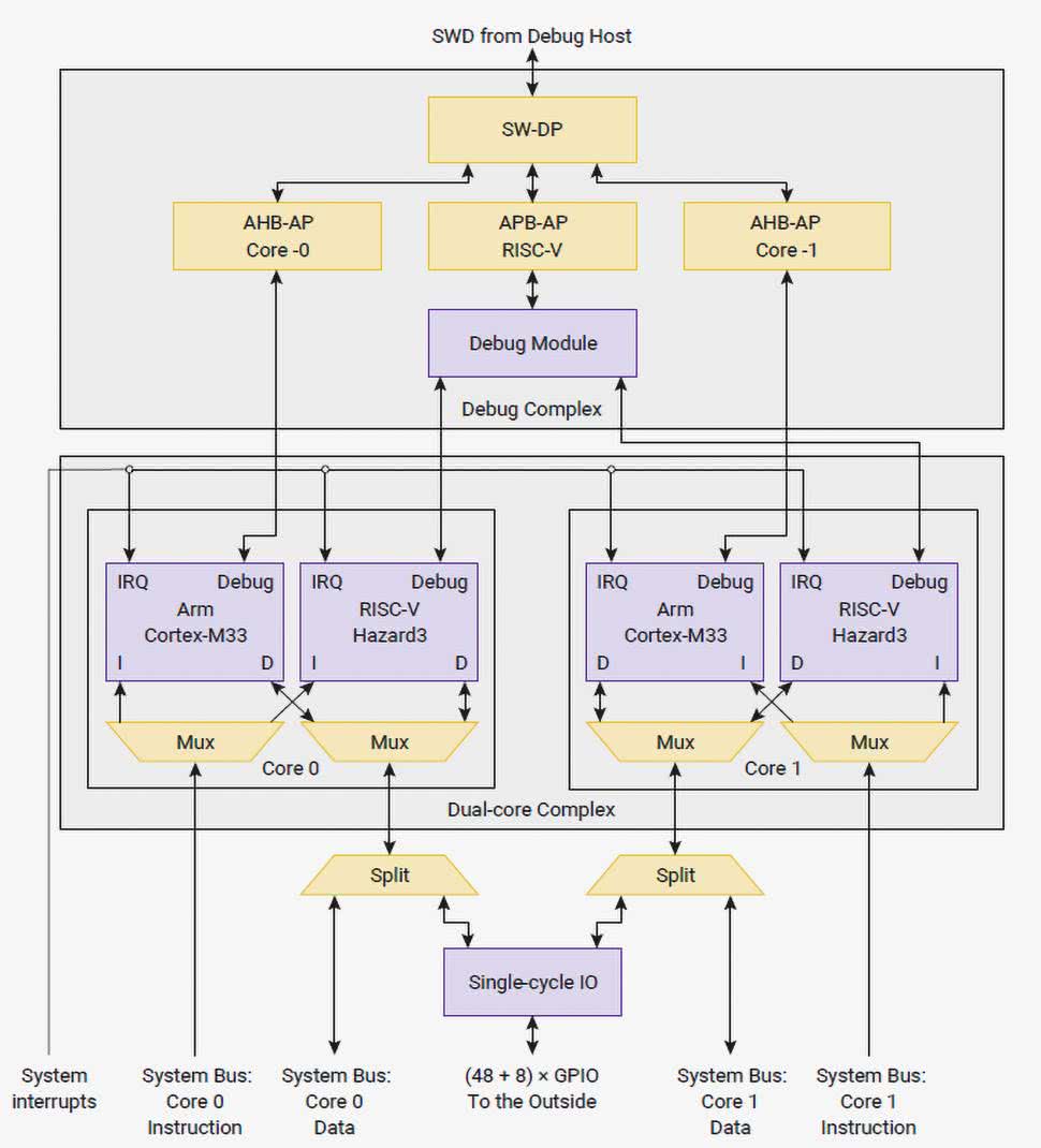 Interfejs debugowania SWD układu RP235x współpracuje z trzema blokami – dwoma dla rdzeni Cortex-M33 i jednym wspólnym dla dwóch rdzeni RISC-V.