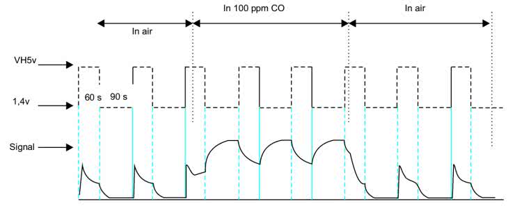 - faza grzania (czyszczenia): 5 V przez 60 sekund. W wysokiej temperaturze pochłonięty CO i inne związki odparowują z płytki czujnika,