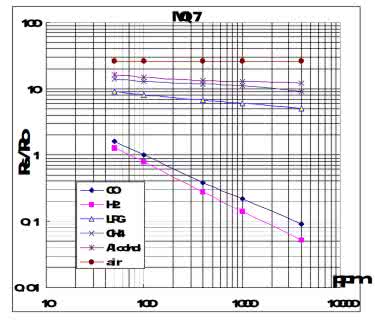 Typowa czułość czujnika MQ-7 na różne gazy w standardowych warunkach pracy jest pokazana na rysunku 4. Wartość R0 to rezystancja czujnika przy stężeniu CO równym 100 ppm, Rs to aktualna rezystancja czujnika podczas pomiaru.